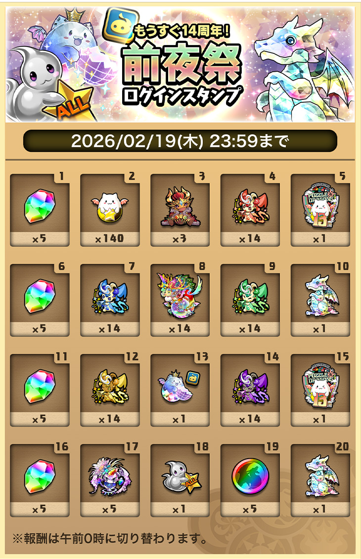 「もうすぐ14周年!前夜祭ログインスタンプ」実施!