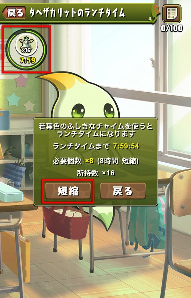 「若葉色のふしぎなチャイム」を必要数使うと、すぐにランチタイムになるぞ!