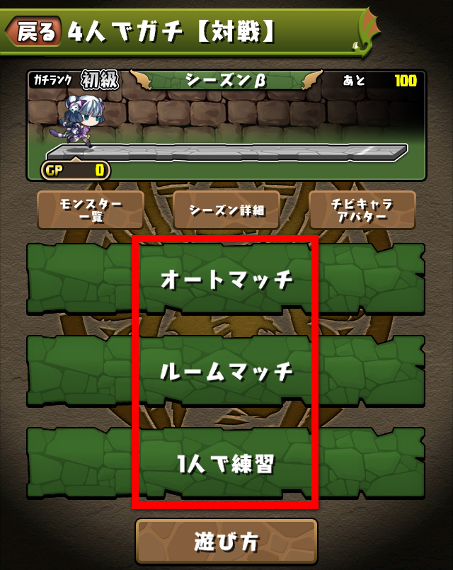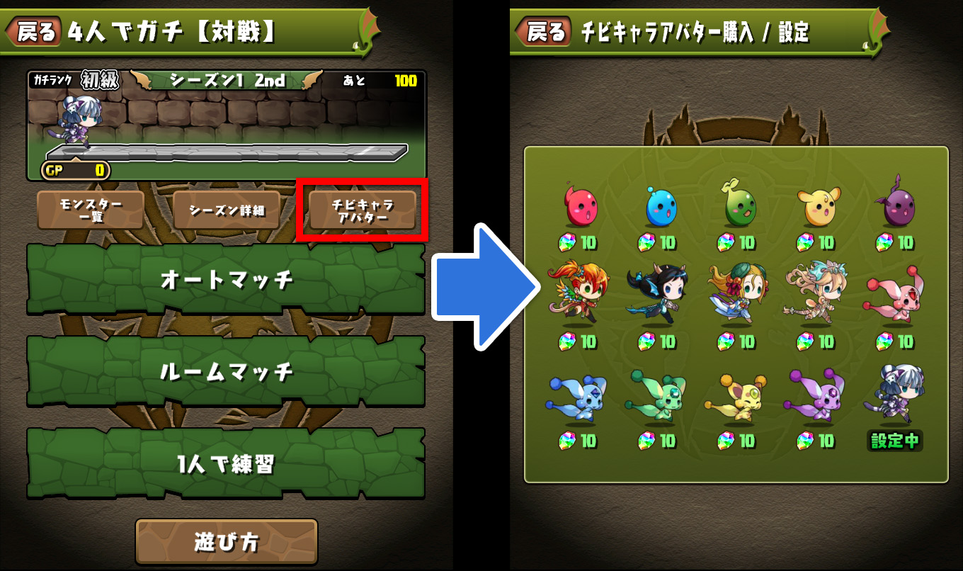 ※[その他]-[オプション]-[ダンジョン]の「4人でガチ【対戦】?ボタン表示」で、表示位置を左と右で選択することができます。 - ③ あなたの「チビキャラアバター」が表示されます。