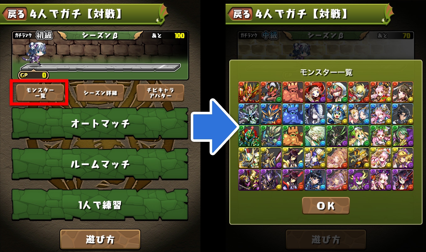 ★対戦前に、「モンスター一覧」から、5体の候補に選ばれるモンスターたちが確認できます。