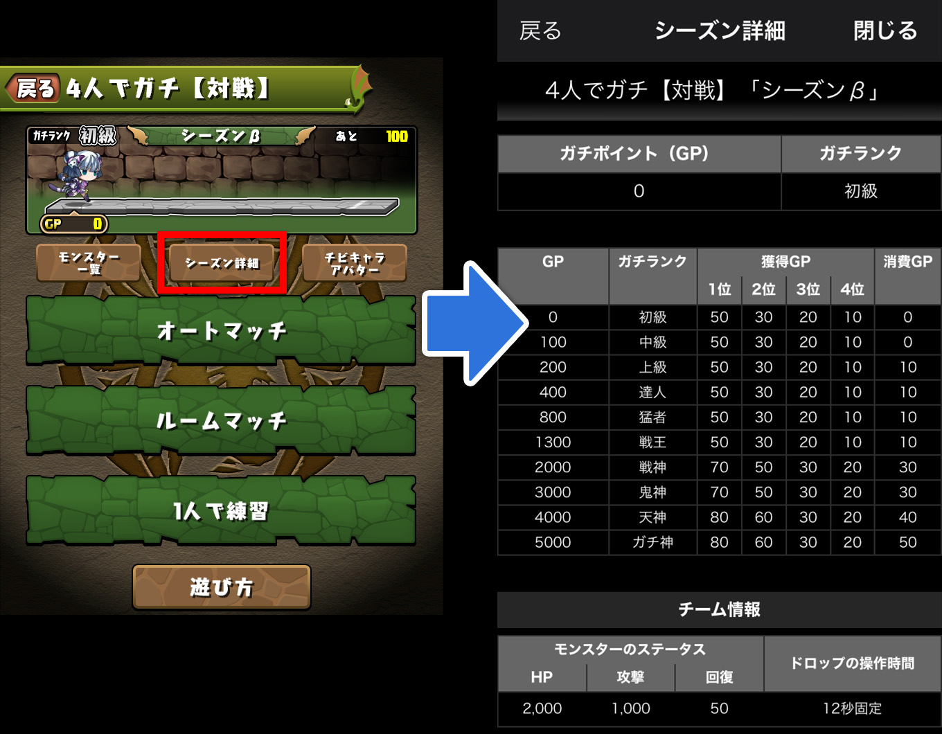 GPの所持量によってガチランクが昇格または降格します。